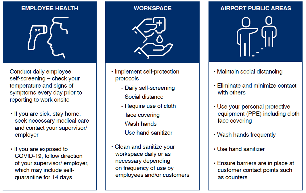 One airport employed an application that was open to travelers and employees and provided information on what is required at the airport. Other airports used manager forums, which were passed on to teams through an authority-wide email, with associated bulletins being shared with airport vendors. An airport commission used signage throughout the airport after the onset of the COVID-19 pandemic. Figure 1 was taken from their COVID-19 preparedness plan, to remind their employees about personal hygiene, screening, and social distancing.
